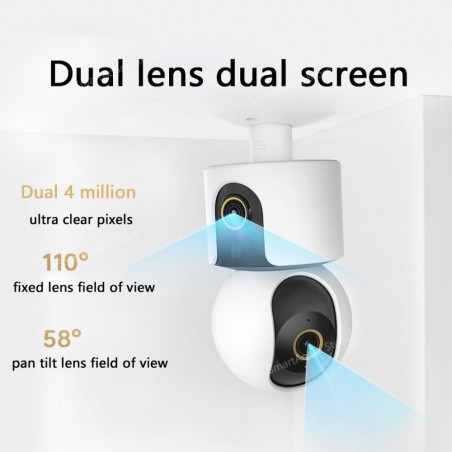 XIAOMI C300 DUAL- 2 Capteurs avec Résolution de 3 MP - Résolution Vidéo: 2304 × 1296 pixels - Rotation à 360° Panoramique horizontal - 88° Inclinaison verticale - Vision nocturne: Jour/Nuit - Distance focale: Téléobjectif 6 mm Rotatif pour capturer tous les détails - Objectif à courte focale Fixe 2,8 mm pour une vue d'ensemble - Détection des personnes grâce à l’IA - Haut-parleur et Micro intégré - 12 Lampes LED avec éclairages infrarouges de 940 nm -  Stockage : Carte microSD (de 16 à 256 Go) - Un son clair et puissant lors des appels - Micro avec annulation intelligente du bruit - Fonctionnalités: Détection locale de personnes,Détection locale de sons, Clôture virtuelle, Contrôle à distance depuis votre téléphone, Installation possible en position verticale ou inversée - Garantie: 1an